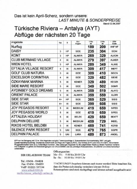 !Wenn Ausgebucht, dann Ausgebucht!!Auch Sie möchten Wellness- Urlaub!!Jetzt schon für die Türkische-Riviera April 2007 den Urlaub buchen.Wir haben jetzt schon Angebote ab 4* All-Inkl. im Doppelz. p.P. ab 299, - Euro von allen Deutschen Flughäfen.Auch andere Urlaubsziele Weltweit vorhanden.Schauen Sie einfach nach. Oder rufen Sie uns doch einfach an:IHR URLAUB3000 TEAMÖffnungszeiten:Mo - Fr.: 9:00 bis 20:00 UhrSa - So.: 10:00 bis 19:00 Uhr!!!ACHTUNG!!!Angebote können auch teurer werden! Bitte beachten Sie, dass die Preise sich ständig verändern können.Online-Reiseangebote sind stark nachgefragt und können schnell ausgebucht sein!