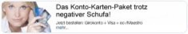Schufafreies Girokonto mit EC-Karte inkl. Visa-Prepaid-KreditkarteKeine Ablehnung bei Hartz 4 EV Arbeitslosigkeit ein Konto für alle!!!Entdecken Sie jetzt Ihre schufafreie Alternative, auch hervorragend als Zweitkonto geeignet. Ihr Konto wird bei einer deutschen Bank geführt und ist versehen mit einer Prepaid-Visakarte sowie einer EC-Karte, auch für Bargeldauszahlungen weltweit. Aufgrund der kostenlosen Kontoführung und dem hervorragenden Onlinebanking zur Finanzverwaltung haben Sie hierbei ein Konto, welches Sie dank der neu eingeführten Europa-Überweisung vorbehaltlos als Gehaltkonto eingesetzt werden kann. Schufafrei und Pfändungssicher. Nutzen Sie jetzt Ihre Chance und beantragen Sie gleich Ihr neues schufafreies Girokonto.http:/ / www.girokontomiteckarte.de